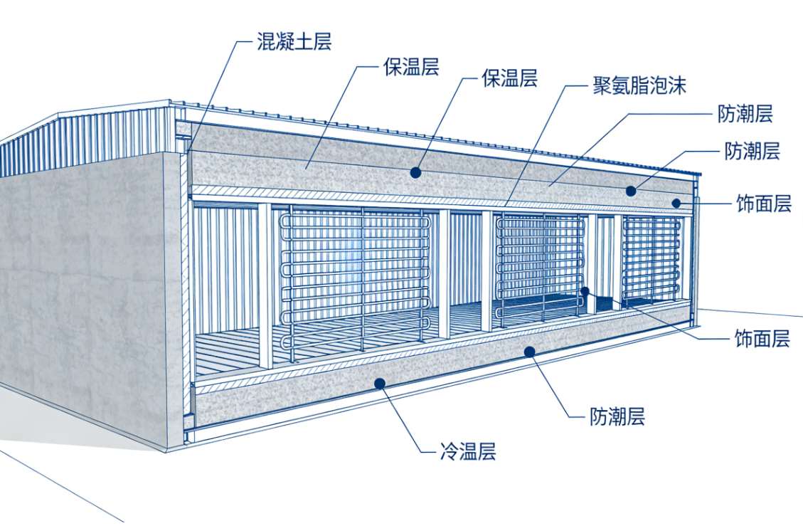 它的主体一般分为地下层、地上层,地下层主要用来布置制冷机房、设备管线,还有部分缓冲区域,地上层就是核心的储藏空间——通常会划分成不同温度分区,比如冷藏区和冷冻区,有的还会单独留出分拣、打包的过渡间,避免外界温度影响库内温度稳定。墙体、地面、屋顶都会做多层保温处理,常用的保温材料有聚氨酯、聚苯板,毕竟要长期维持低温,保温效果直接决定了后期的能耗,这一点可不能马虎。