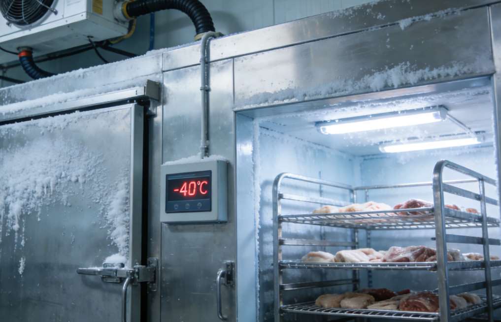 很多人可能好奇,它为啥能冻得这么快?其实核心就是它的制冷系统,不像普通冷库那么简单。主流的是机械压缩制冷系统,主要由压缩机、蒸发器、冷凝器、节流装置这几部分组成——简单说,压缩机就像“心脏”,负责压缩制冷剂,产生冷量;蒸发器装在库内,负责把冷量释放到库中,快速降温;冷凝器则是把压缩机产生的热量排出去,保证制冷循环正常运行。